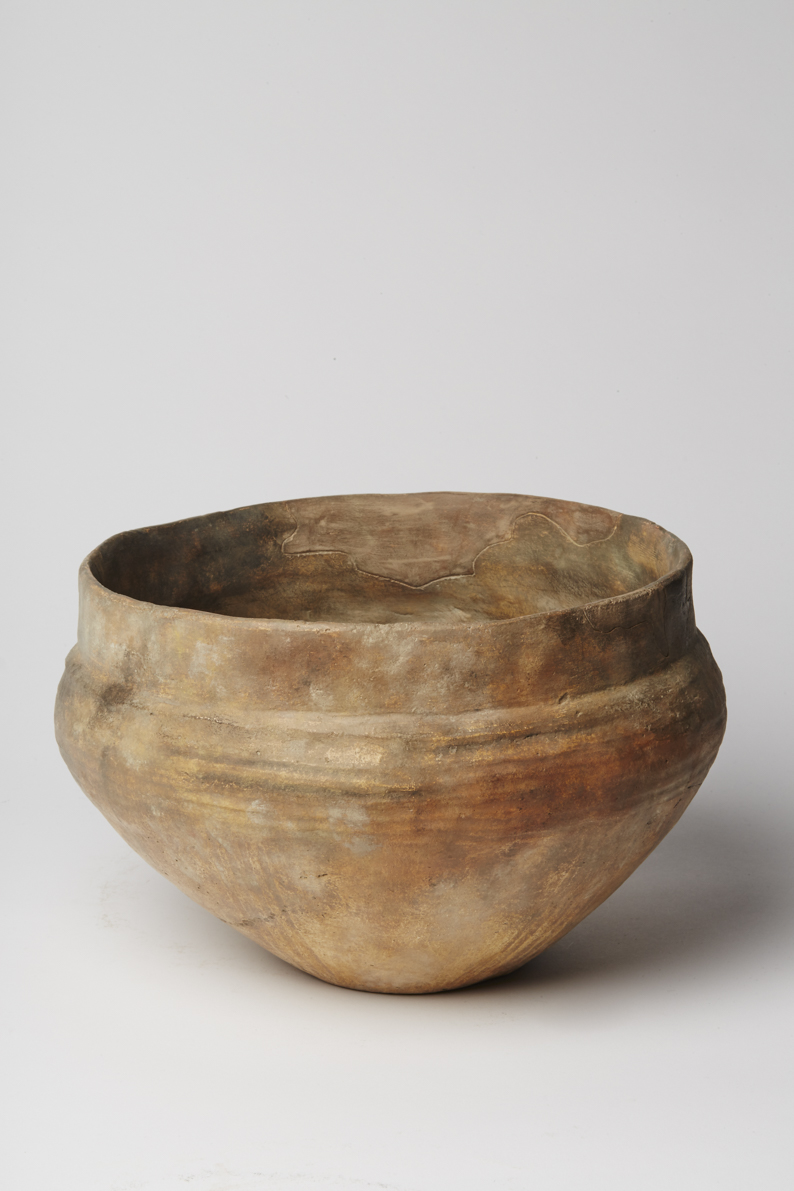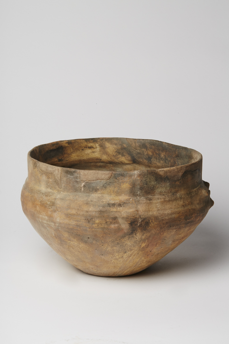 Ein Fundstück aus der Frühgeschichte des Berliner Raumes ist diese Aschenurne, die 1895 beim Bau eines Hauses im Stadtteil Karlshorst in einem Grab gefunden wurde. Das gelbliche, schalenförmige Gefäß mit abgesetztem, senkrechtem Hals besaß einst einen Henkel, der nicht mehr vorgefunden wurde, aber durch die Bruchstelle sichtbar ist. Diese ist von drei kegelförmigen Knubben umgeben. Sie wurde erst 1995 abgeformt.