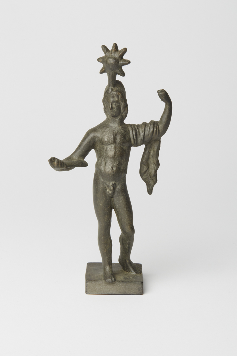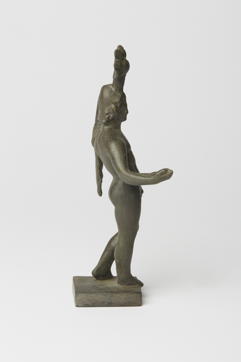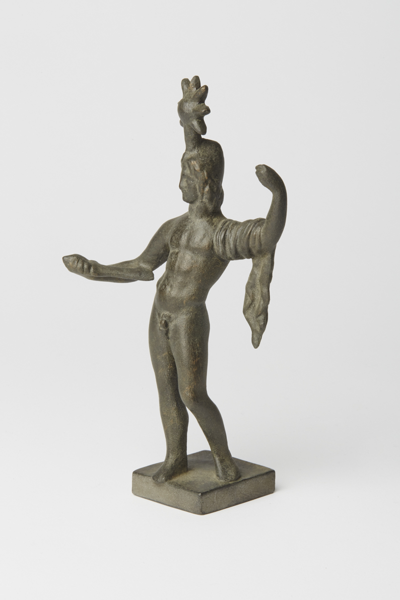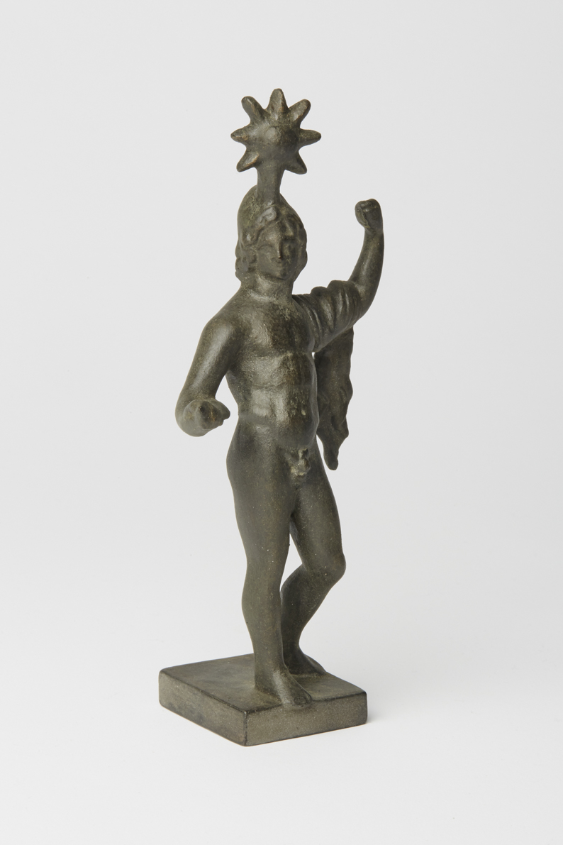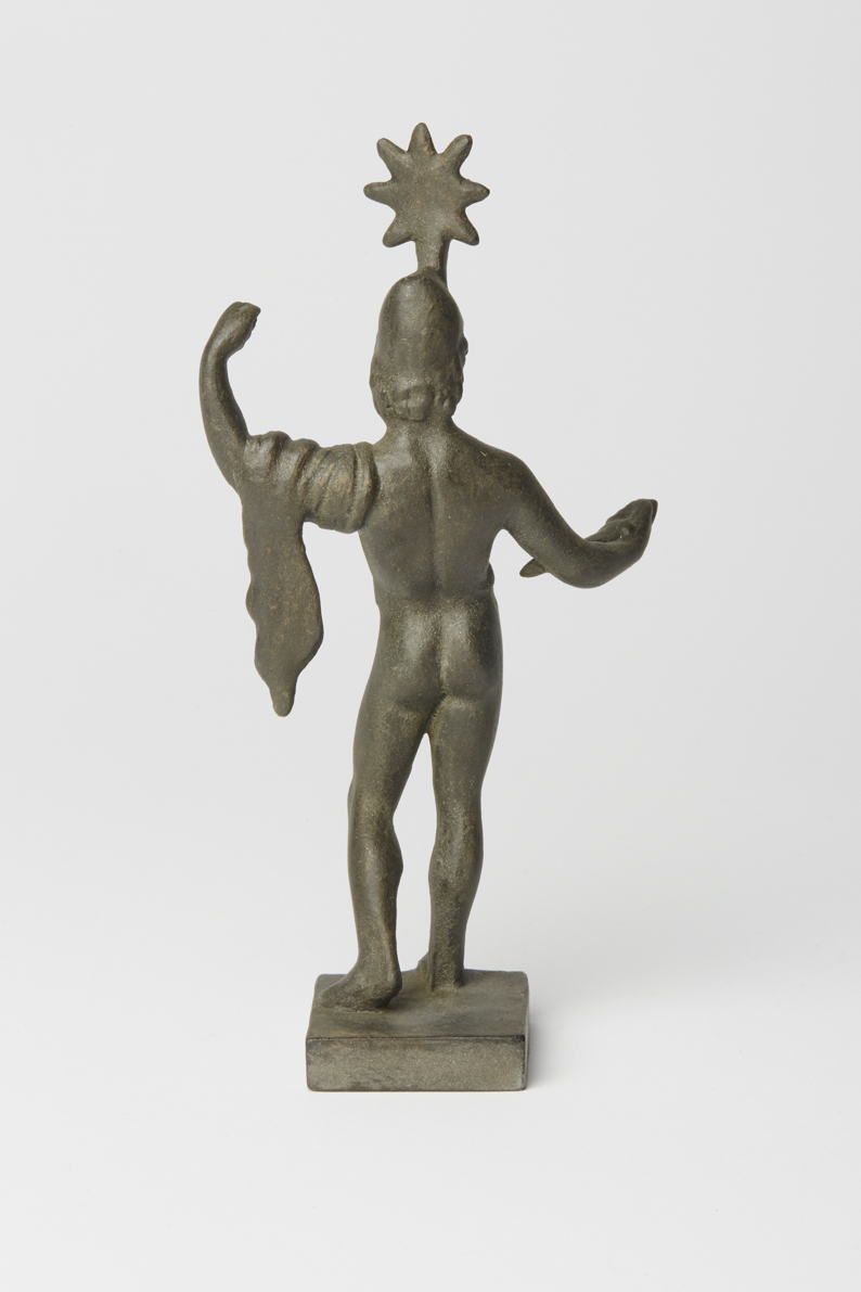 Im charakteristischen Kontrapost von Standbein und Spielbein ist dieser klassische nackte Jüngling dargestellt. Der auf dem Haupt aufsitzende Stern weist ihn als einen der beiden Dioskuren aus, die wegen des nach ihnen benannten Sternbildes den Himmelskörper als Attribut hatten. Als Dioskuren bezeichnet man das unzertrennliche Brüderpaar Castor und Pollux. Beide wurden wiederholt als Rossebändiger dargestellt, am berühmtesten in dem antiken Statuenpaar, das heute auf dem Quirinalsbrunnen in Rom zu finden ist. Auch bei dieser Bronzestatuette ist die Armhaltung als Halt eines Zügels zu interpretieren. Unter der Formnummer R-00174 ist das Pendant zu finden.