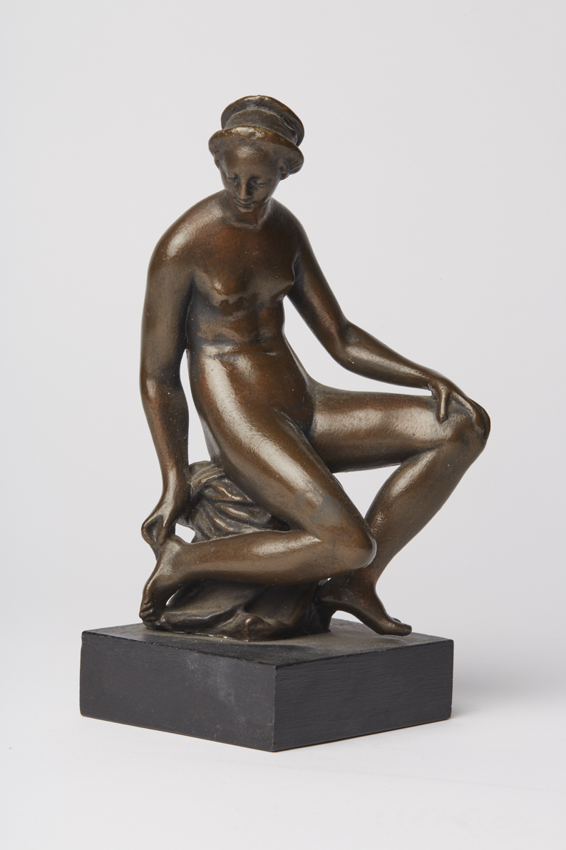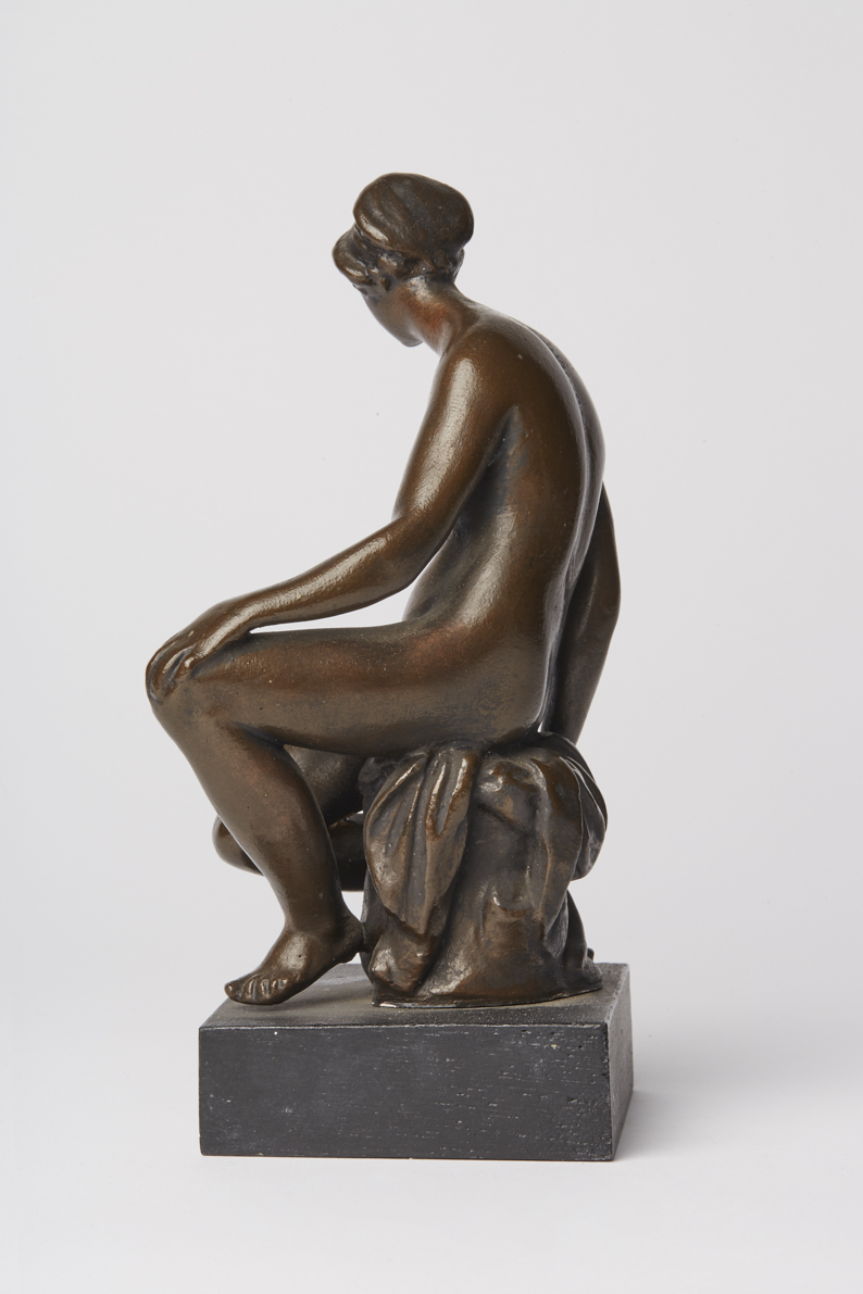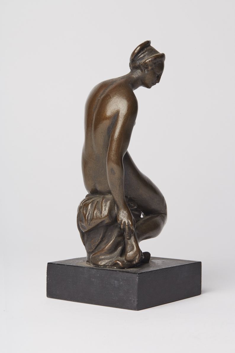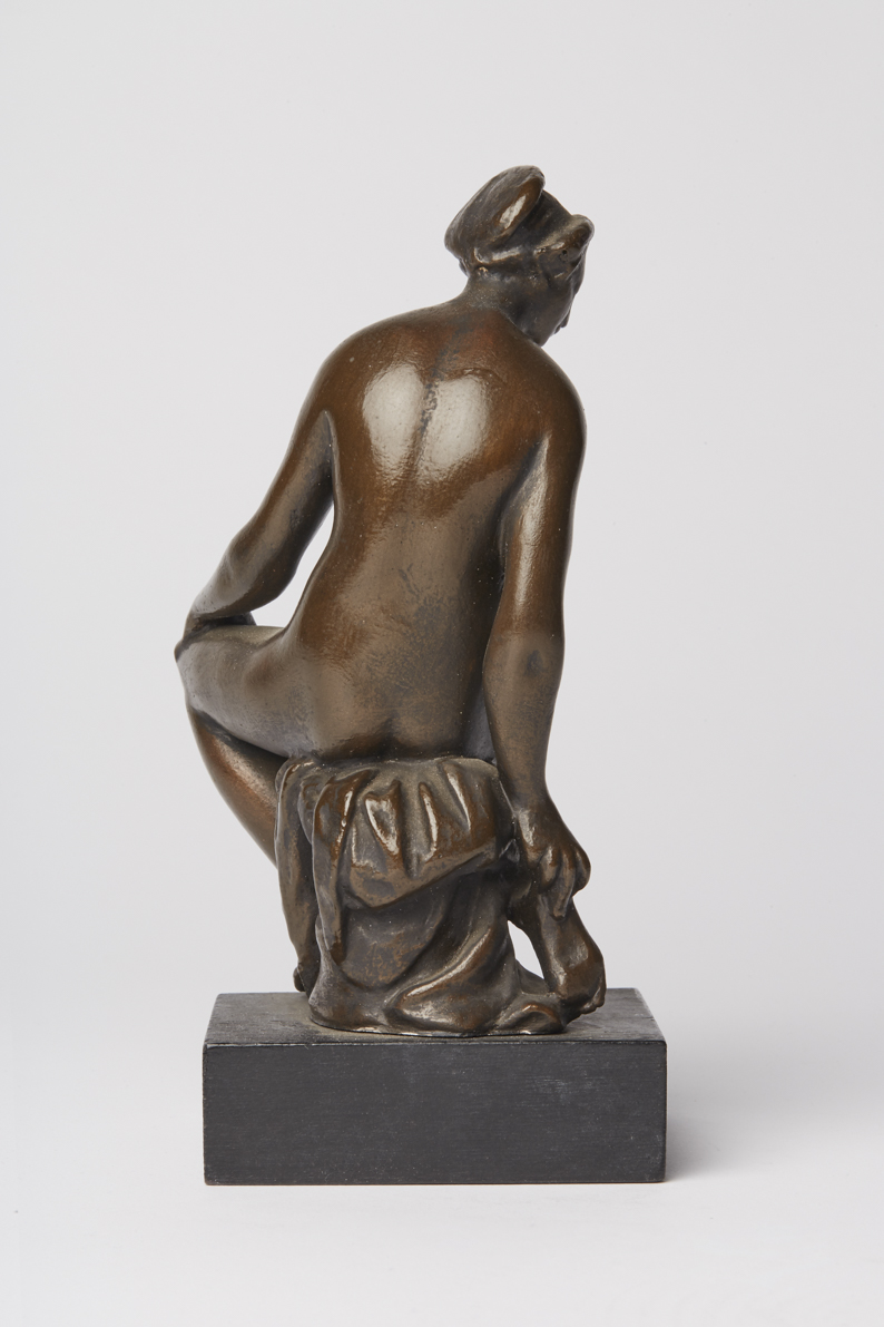 Von allen Seiten schön – dies war das Ideal der Kleinbronzen in der italienischen Hochrenaissance. Die Statuette der nackten badenden Frau erfüllt diesen Anspruch aufs vortrefflichste. Die durchaus komplexe Haltung vermochte der Bildhauer so umzusetzen, dass der Griff zum Tuch, auf dem sie sitzt, ebenso selbstverständlich erscheint wie die leichte Drehung des Oberkörpers. In der Figur lebt das Vorbild der antiken Venus beim Bade weiter, ohne dass diese konkret dargestellt sein muss.