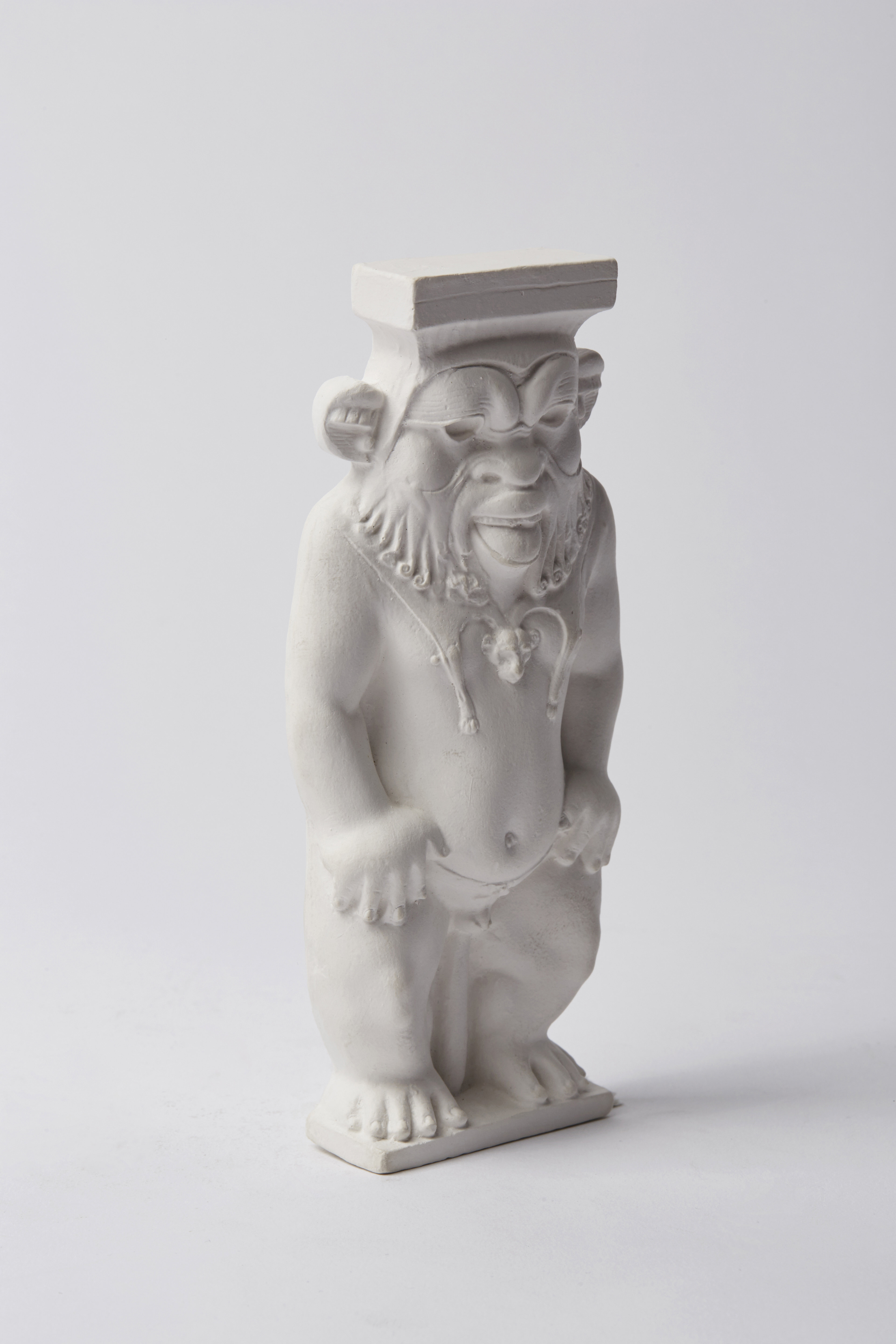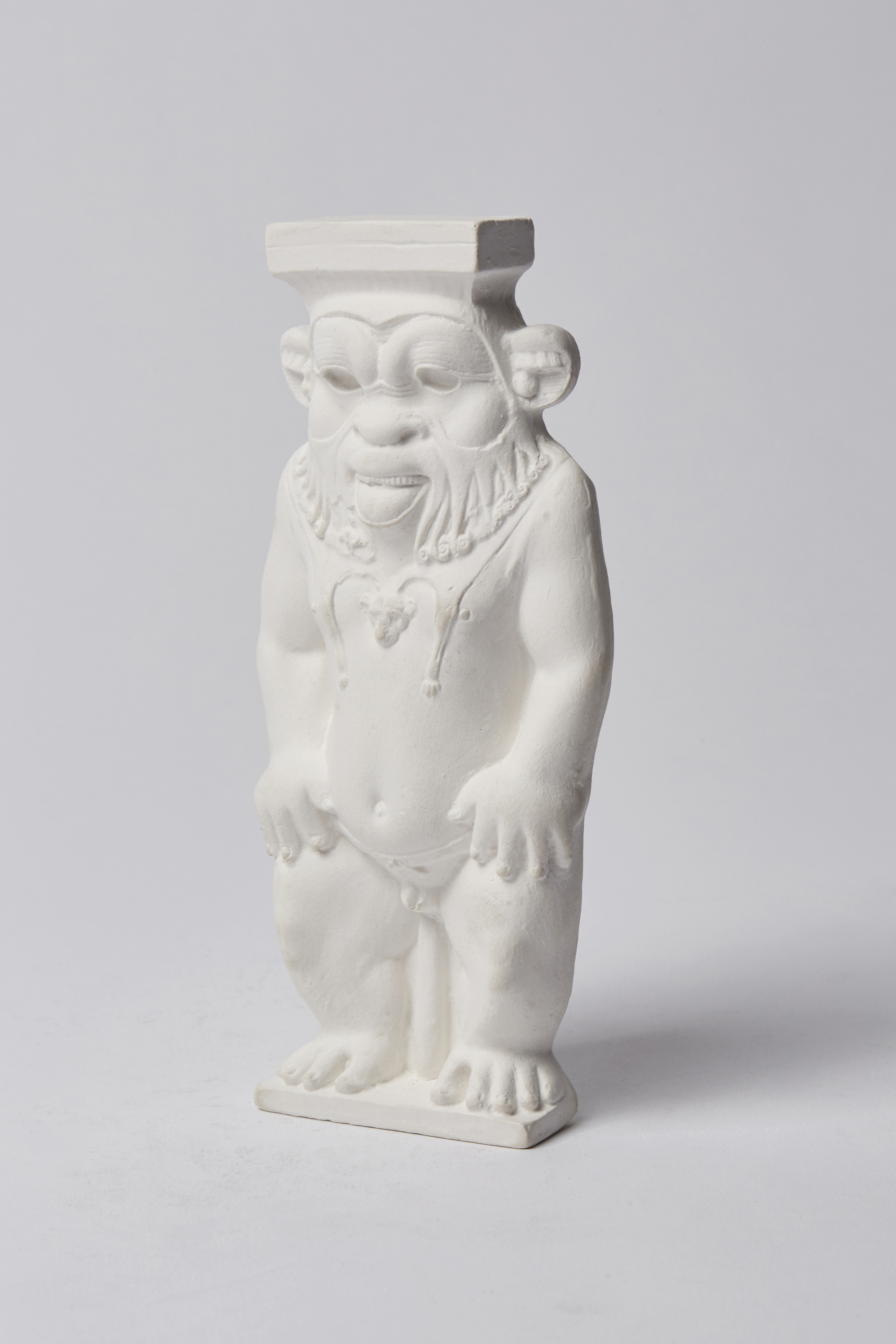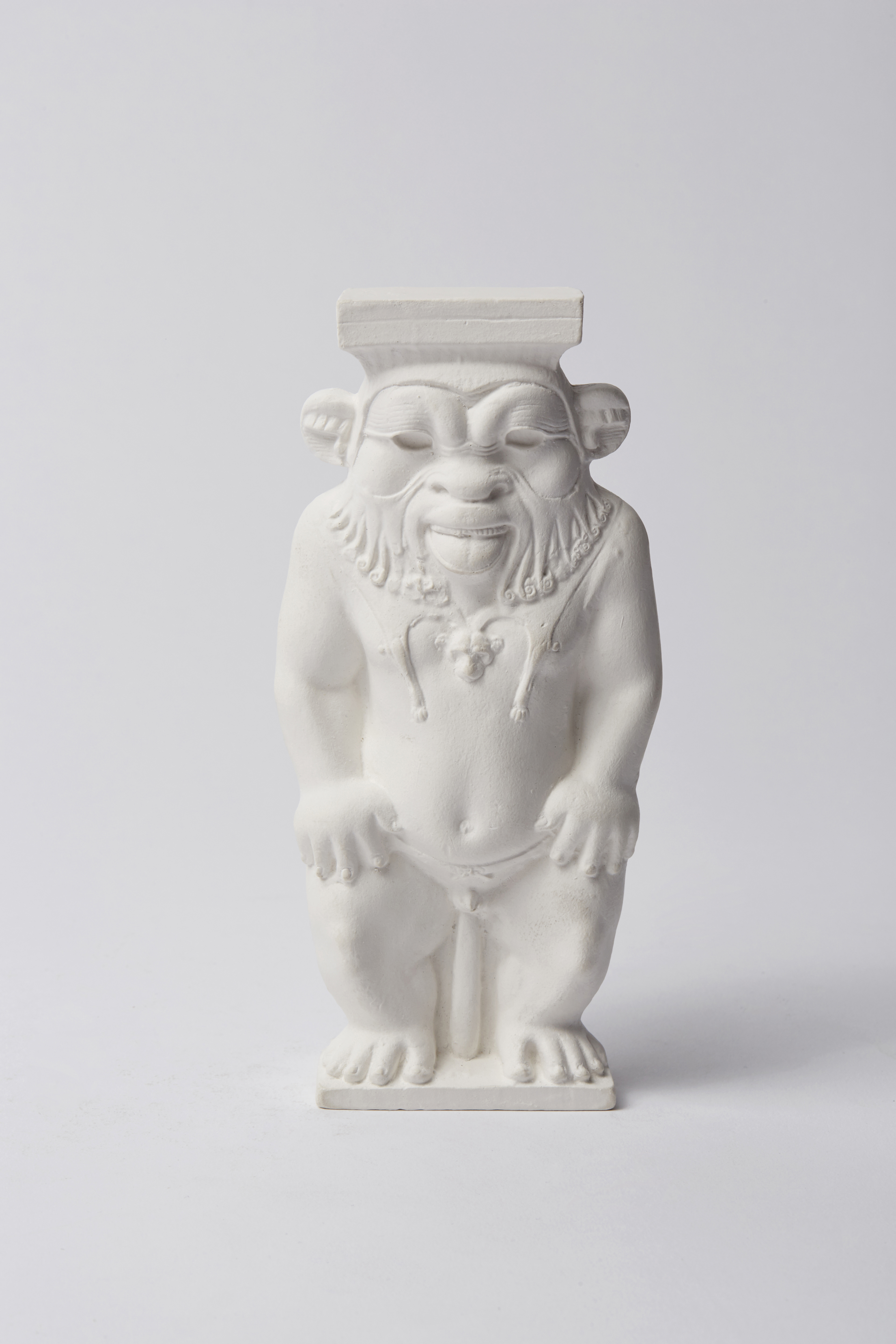 Die kleine Figur zeigt den altägyptischen Gott Bes. Dieser schützte in der Nacht die Schlafenden vor gefährlichen Wüstentieren, insbesondere vor Schlangen, denen er mit Messern den Garaus machte. Zugleich wurde der wilde kleine Mann als Schutzgott der Schwangeren, Gebärenden und Neugeborenen verehrt, weswegen er oft an Betten, insbesondere an Hochzeitsbetten, aufgestellt oder –gehängt wurde. Aus dieser Tradition heraus wurde er schließlich auch zum Beschützer neugeborener Gotteskinder, d.h. der Nachkommen der Pharaonen.