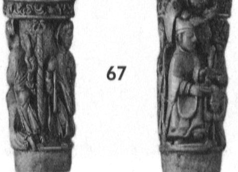 Ein Meisterwerk der englischen Elfenbeinschnitzerei aus dem beginnenden 12. Jahrhundert ist dieser Stab, der zu einem sogenannten Flabellum gehört. Mit diesem Begriff bezeichnet man einen Fächer, der während des Gottesdienstes zum Vertreiben der Fliegen verwendet wurde. Im frühen Mittelalter wurde aus diesem liturgischen Gebrauchsgegenstand ein oftmals repräsentativ gestaltetes Objekt. Um den Stab ziehen sich Bildfelder in vier Zonen, durch zum Teil ornamentierte Bänder getrennt. In diesem untersten Streifen finden wir einen Heiligen Bischof, Johannes den Täufer und zwei weitere Heilige. Das Original ist verschollen, womit die Erhaltung der authentischen Form in der Gipsformerei als besonderer Glücksfall anzusehen ist.