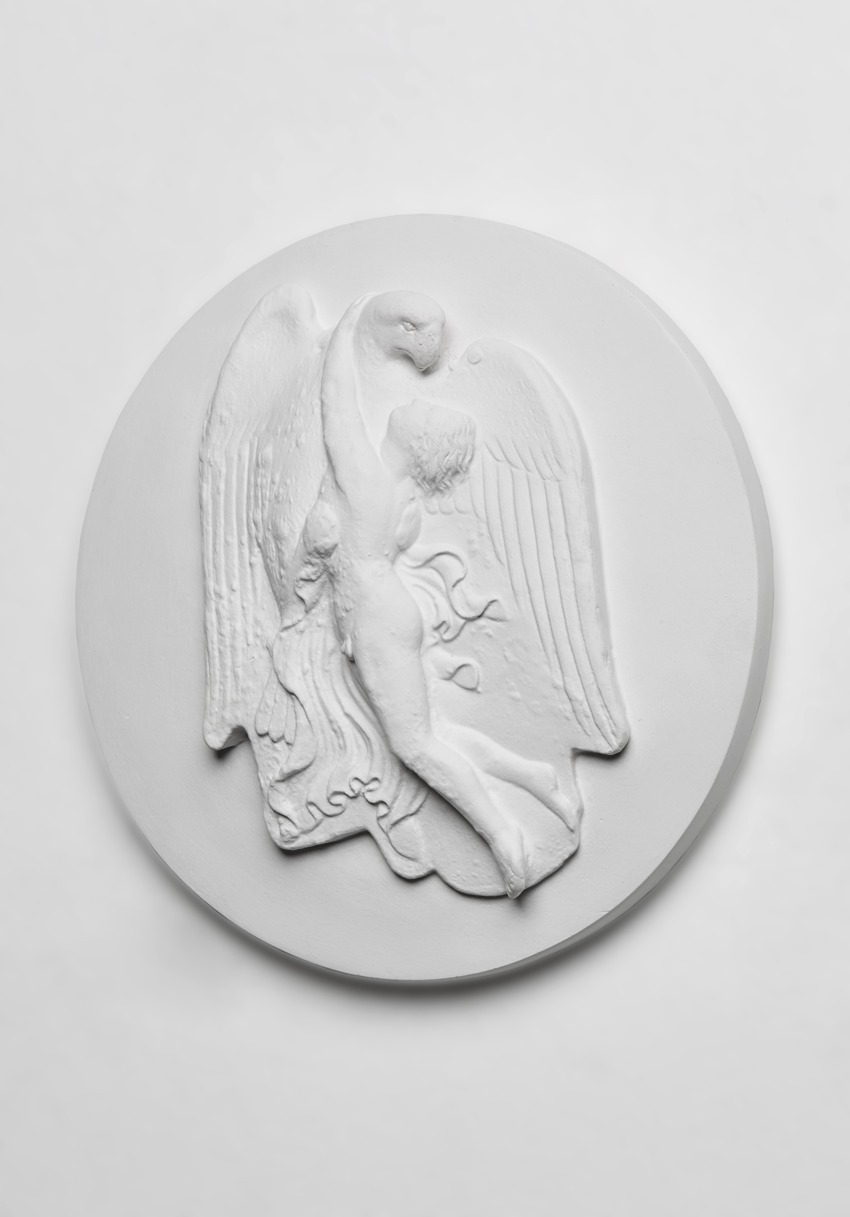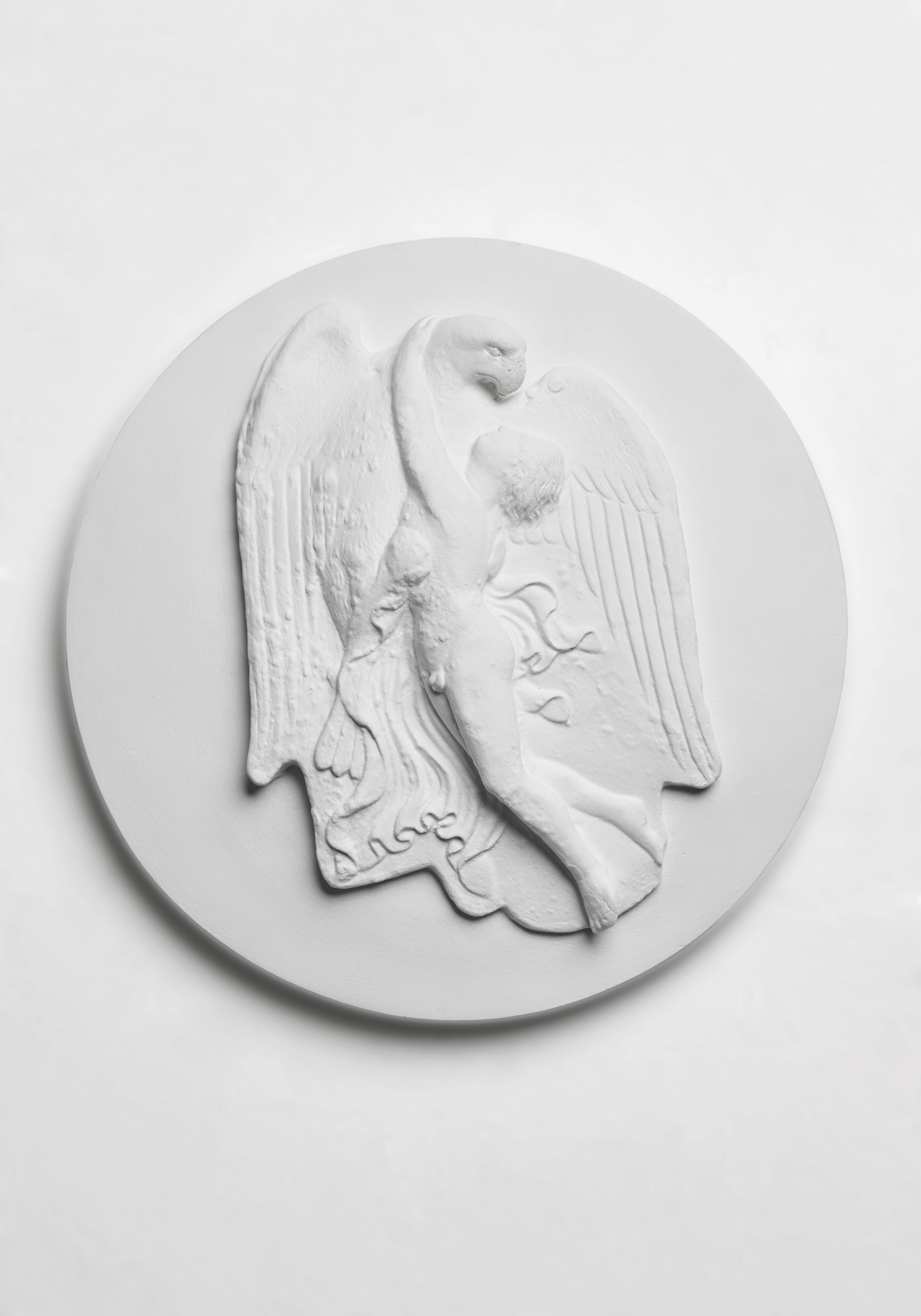 Dieses Rundrelief lebt von spannungsvollen Gegensätzen: Der gestrenge Adler mit seinen fast schon geometrisch geraden Federn steht in großem Kontrast zum hilflos hängenden Knaben mit dem flatternden Gewand, der sich an ihn klammert – ob verzweifelt oder hingebungsvoll bleibt bewusst offen. Die hier dargestellte Geschichte gehört zu den Klassikern der antiken Mythologie: Zeus verliebt sich in Ganymed, den „Schönsten aller Sterblichen“, und entführt ihn als Adler auf den Olymp. Die homoerotisch aufgeladene Geschichte wurde in der Antike immer wieder dargestellt. Das Relief diente als Deckel eines Klappspiegels und befindet sich heute in der Berliner Antikensammlung.