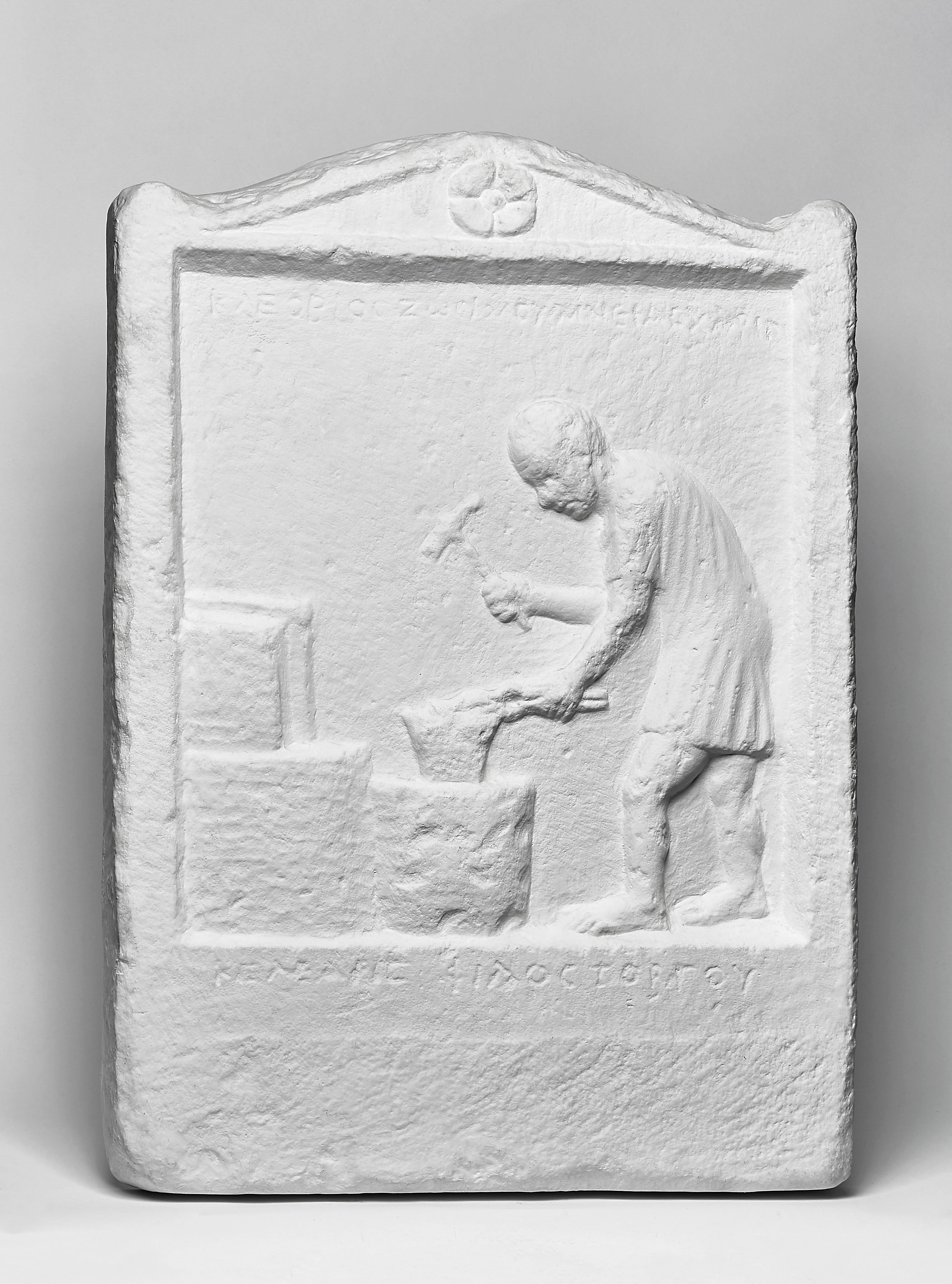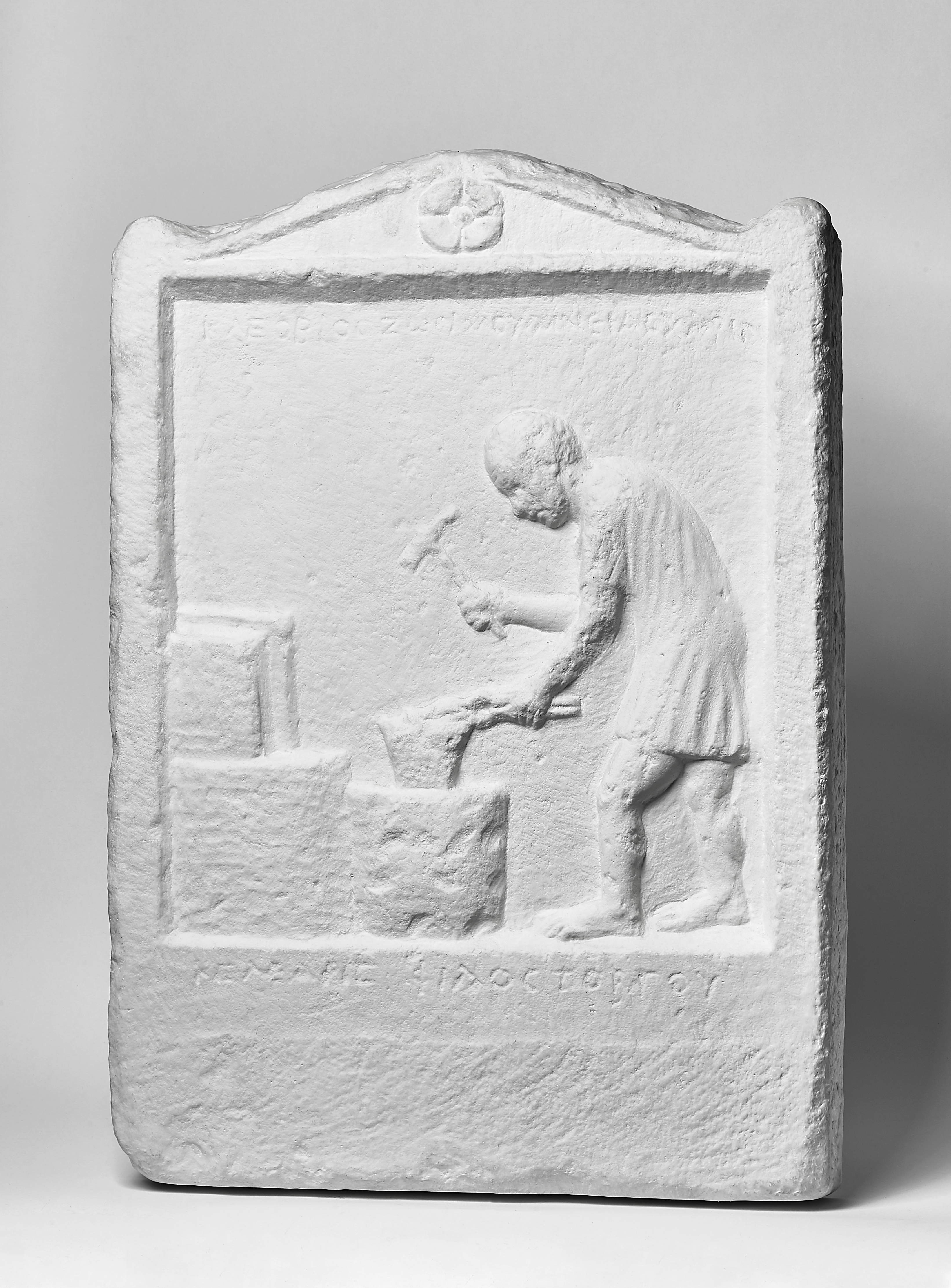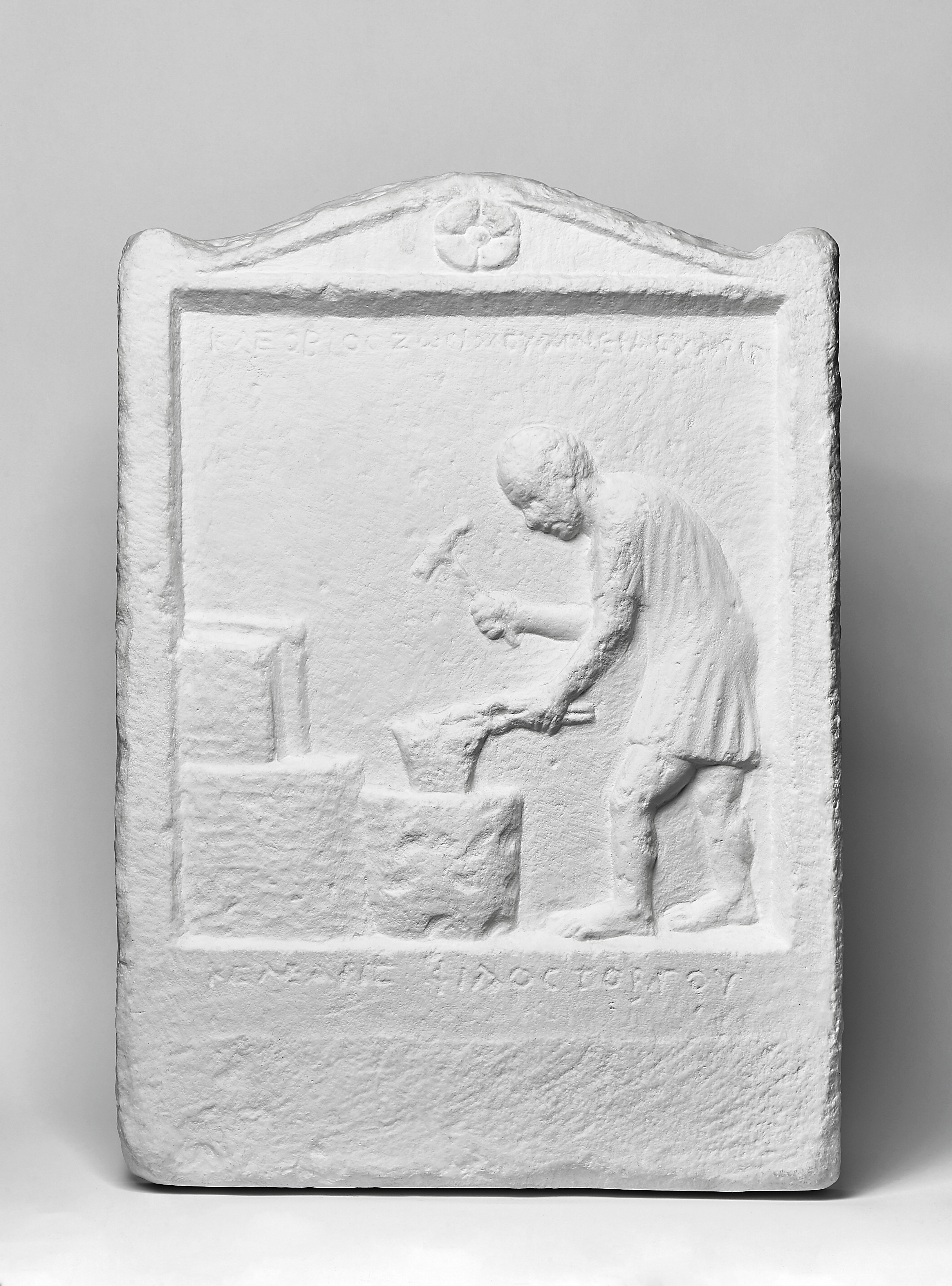 Darstellung des Schmiedes Kleobios als Schmied am Amboß.