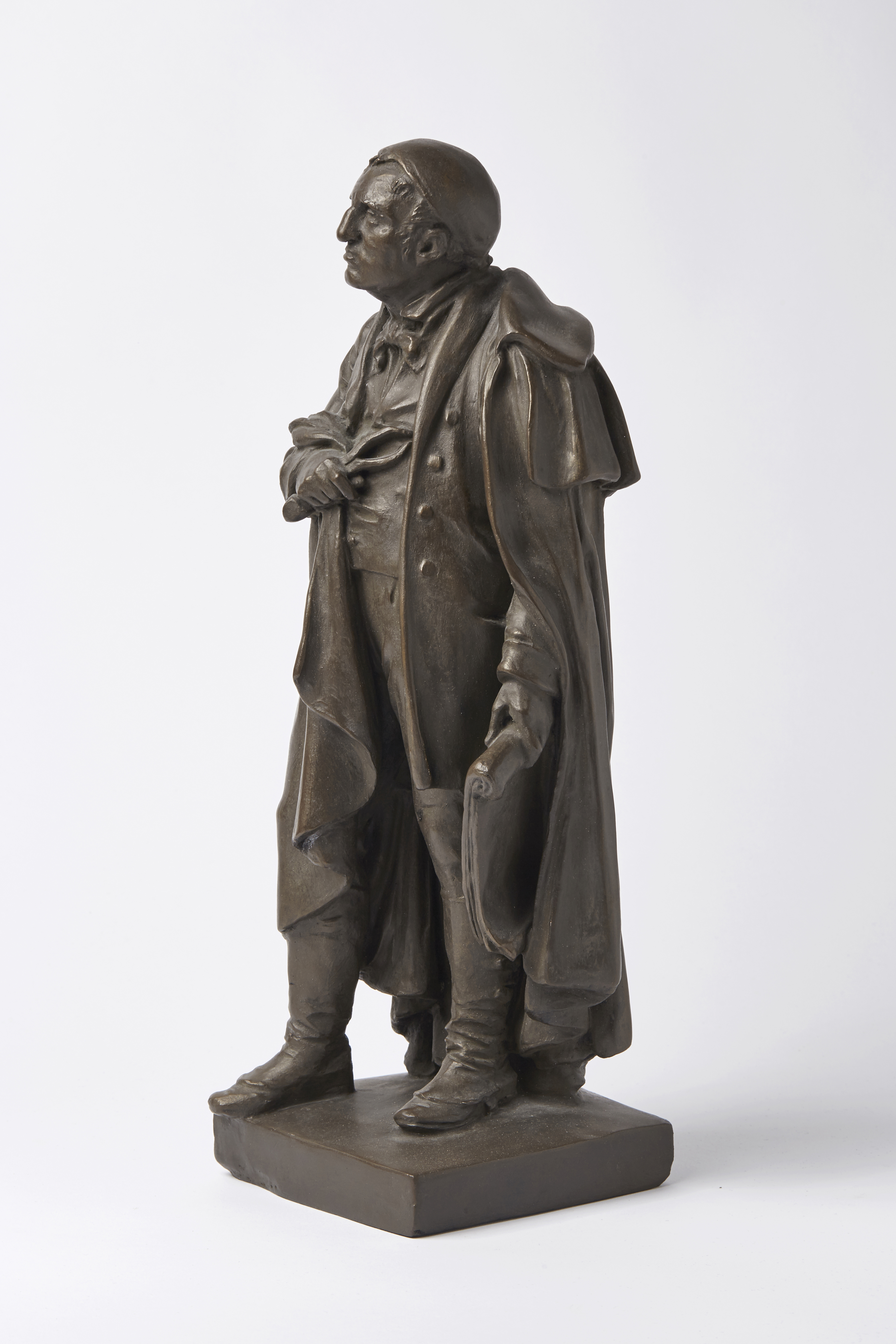 Schadow, der wohl berühmteste unter den klassizistischen Berliner Bildhauern, schuf Werke wie die Quadriga auf dem Brandenburger Tor und die Prinzessinnengruppe. In diesem Altersbildnis von Hugo Hagen trägt Schadow Mantel, eine lange Jacke über der zugeknöpften Weste, eine enge Hose und geknöpfte Stiefel. In der Linken hält er einen Tastzirkel, ein Hilfsmittel der Bildhauer, in der Rechten eine ausgerollte Planskizze. Die Statuette weicht in mehreren Details von der Fassung ab, die Hagen nach dem Tod Schadows für die Vorhalle des Alten Museums in Berlin schuf und geht auf den Originalgipsentwurf des Künstlers zurück, der sich in der Gipsformerei als großer Schatz befindet.