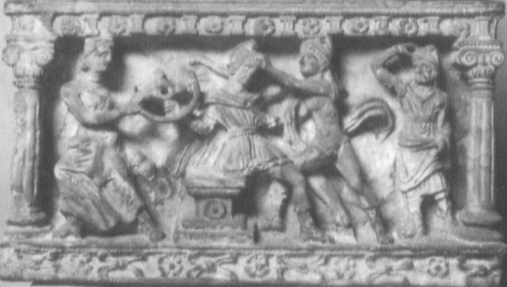 Aufgrund des hier zu sehenden Wagenrads gilt die Szene als Darstellung der Ermordung des Wagenlenkers Myrtilos. Die Urne, zu der diese Vorderseite gehört, wurde in der Casone-Nekropole in Malacena bei Monteriggioni (Toskana) gefunden. Der Aschekasten wurde von einer Bildhauwerkstatt aus Volterra geschaffen. Aufgrund des hellenistischen Stils nimmt man an, dass dieser ein Meister aus Griechenland vorstand.