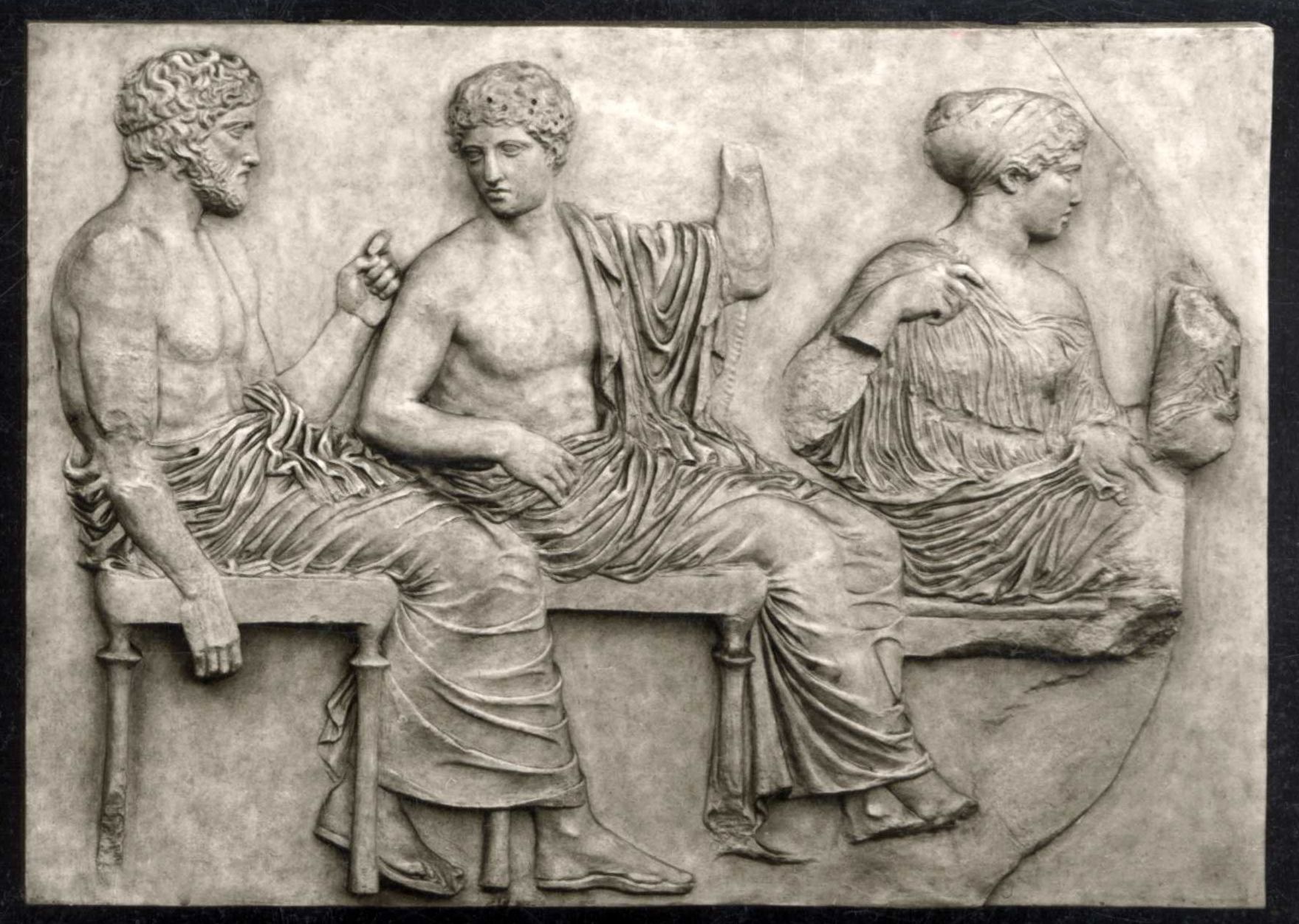 In Erwartung des Festzuges haben sich die griechischen Götter Poseidon, Apoll und Artemis versammelt. Es ist der Tag der „Panathenäen“, mit denen sich das antike Athen alle vier Jahre selbst feierte. Der Parthenon-Fries vom gleichnamigen Tempel auf der Akropolis überhöht dieses Ereignis in vollendeter künstlerischer Form zur Begegnung von göttlicher und menschlicher Welt. Das Relief mit den drei Gottheiten gilt als eine der schönsten Tafeln des insgesamt 159 Meter langen Frieses, der die Außenwand der Cella umlief. Die feierliche Würde der Figuren und viele staunenswerte Details haben dieses Werk weltberühmt gemacht – so etwa die Hand der rechts sitzenden Artemis, die ihr durchscheinendes Gewand anhebt.