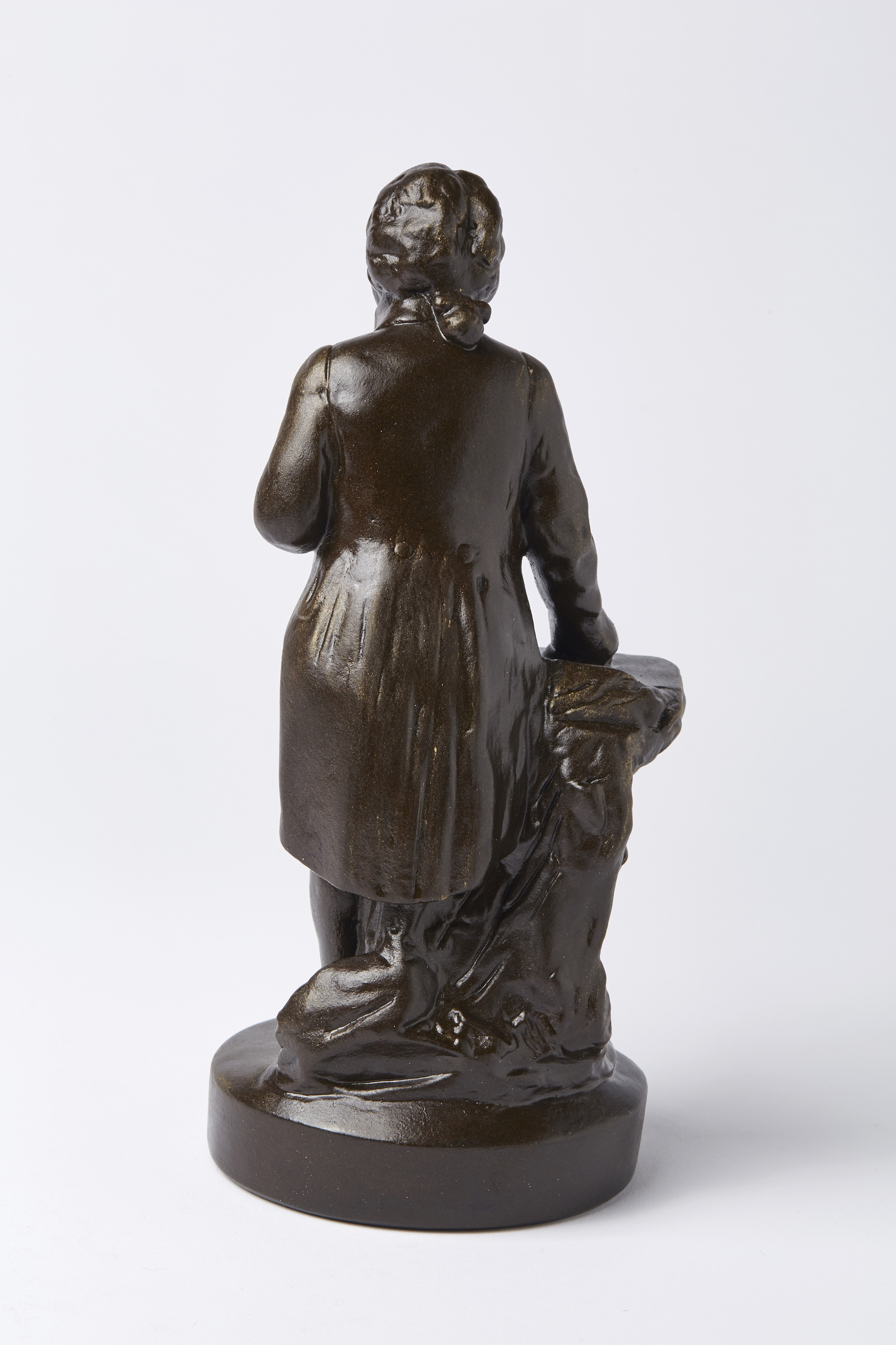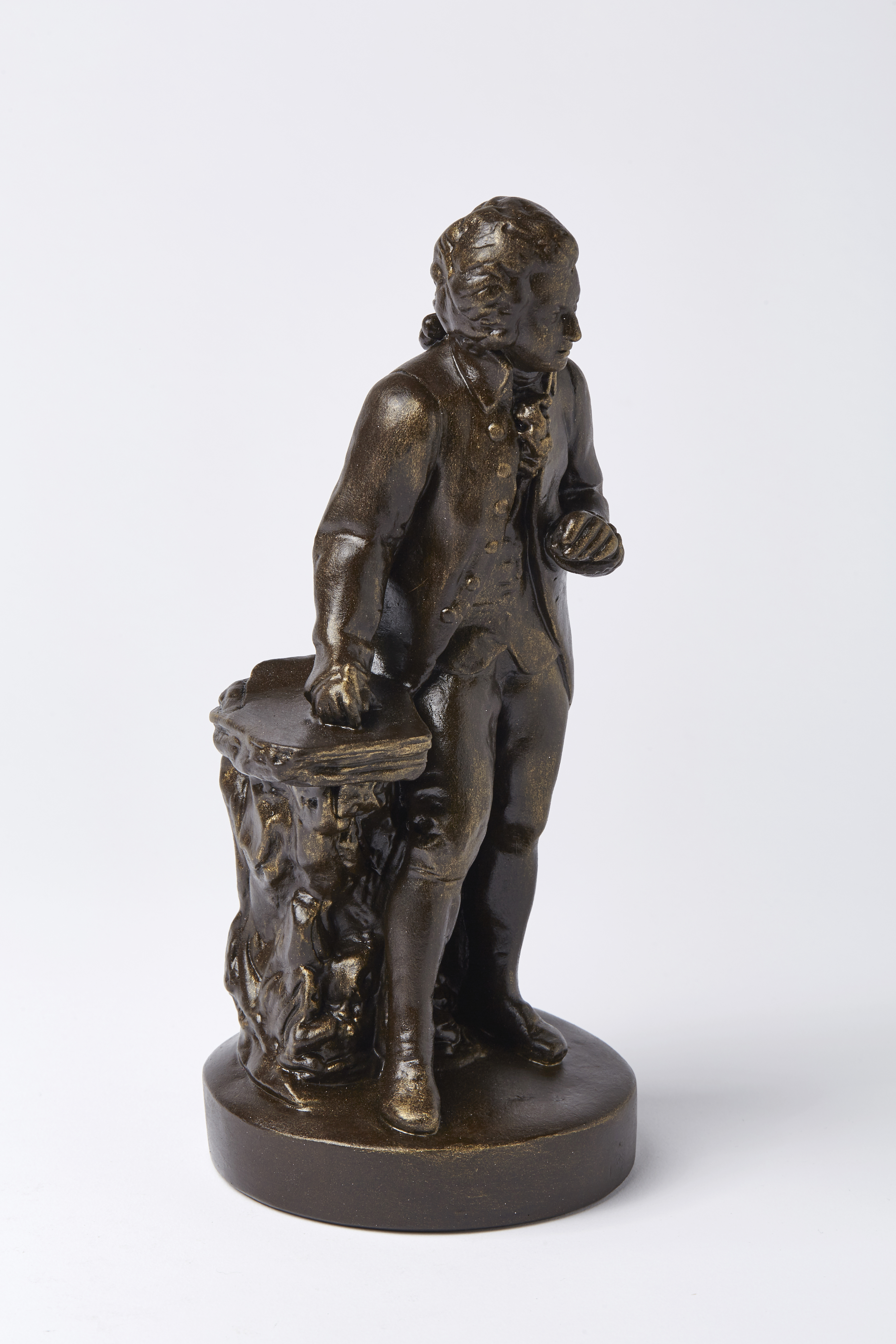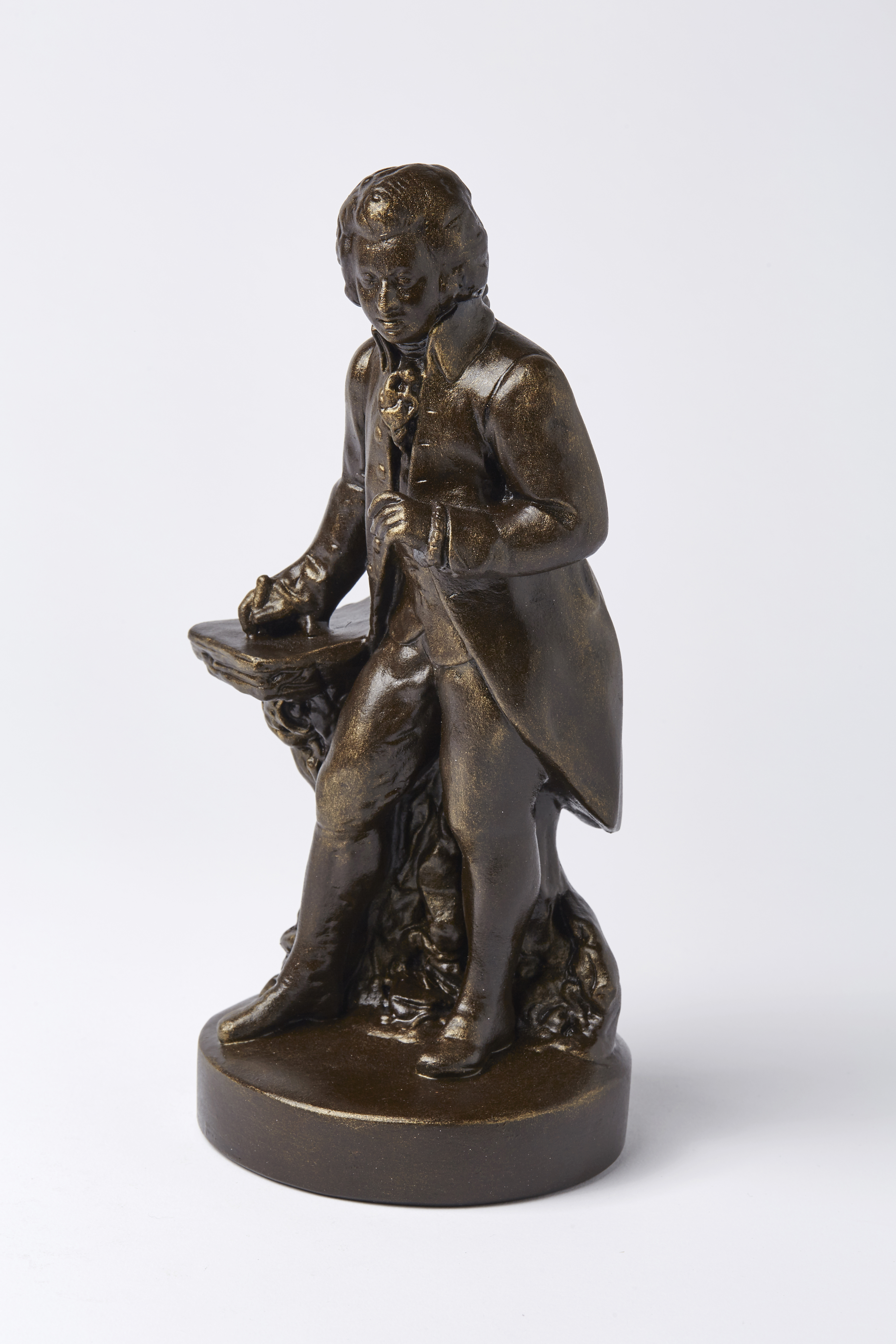 Mit dieser kleinen Statuette fing der Berliner Bildhauer Gustav Landgrebe meisterhaft Mozarts Wesen ein. Der Komponist trägt eine Kombination aus Rock, Weste und Hose. Auch Details wie die Knöpfe arbeitete Landgrebe fein heraus. Zur rechten des Komponisten steht ein felsenartiges Pult, auf dem zahlreiche Notenblätter abgelegt sind. Es scheint, als habe er soeben einen neuen Einfall gehabt und notiert sich auf dem obersten Blatt die Noten. Mozart, der wohl bedeutendste Komponist der Klassik, wurde nur 36 Jahre alt. Er starb wenige Wochen nach der Uraufführung seiner letzten berühmten Oper, der Zauberflöte. Mozart liebte schöne Kleidung und so folgte er der damaligen französischen Mode.