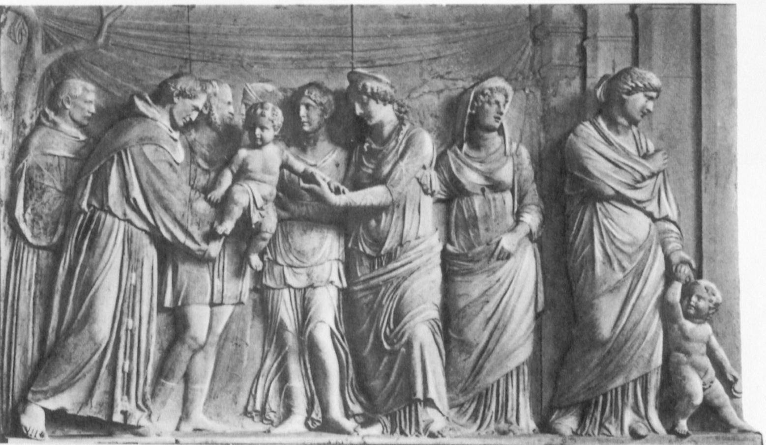 Das Relief erzählt eine Geschichte aus dem Leben des Heiligen Antonius von Padua: Der Heilige im Ordensgewand bringt ein Baby zum Sprechen, welches so bezeugen kann, dass seine Mutter zu Unrecht des Ehebruchs beschuldigt wird. Das Werk des venezianischen Bildhauers Antonio Lombardo aus der Zeit der Hochrenaissance zeugt vom intensiven Studium antiker Sarkophagreliefs – insbesondere die beiden rechts stehenden Frauen sind in Haltung und Gewandbildung klassischen Vorbildern verpflichtet. Lombardos Szene gehört zu einem Zyklus von 9 Relieftafeln in der Chorkapelle der Santo-Kirche in Padua.